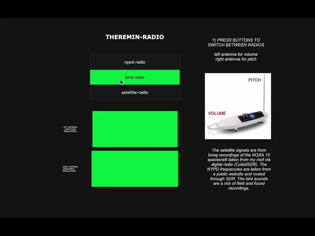 As part of the setup, using MaxMSP I created a three channel 'radio' that switched between birdsong recordings, live NYPD feed (via Cubic SDR using Radio Reference open source data), and satellite beeps (pre-recorded on CubicSDR using an RTL-2 dongle and antenna). The radio is theremin-controlled so the amplitude and pitch/frequency are controlled by your left and right hands over the two antennas. This 'radio' is very much a prototype and I would like to develop it to be more live-reactive and have more senstitive parameters, particularly with the NYPD radio which often came out as muffled or static.
