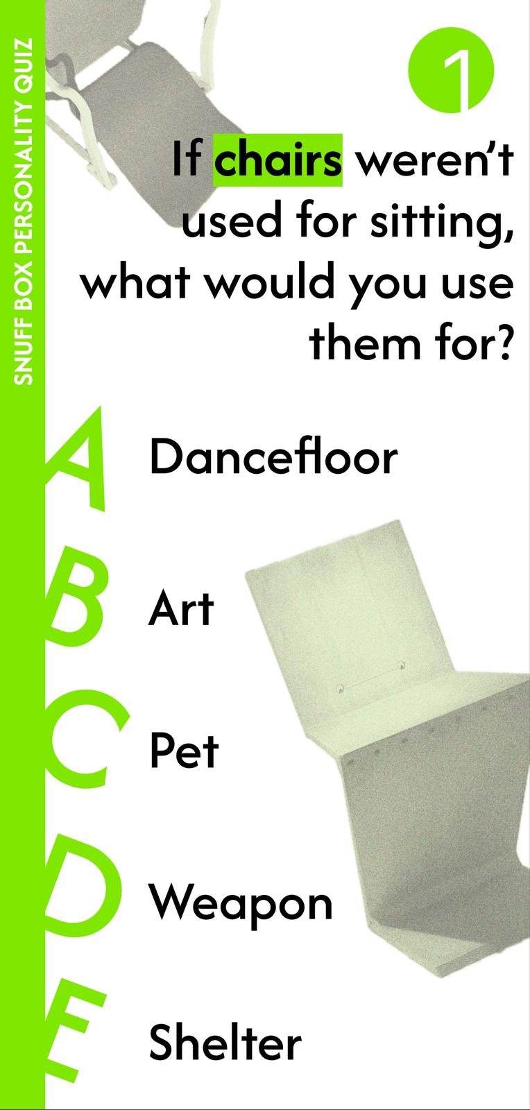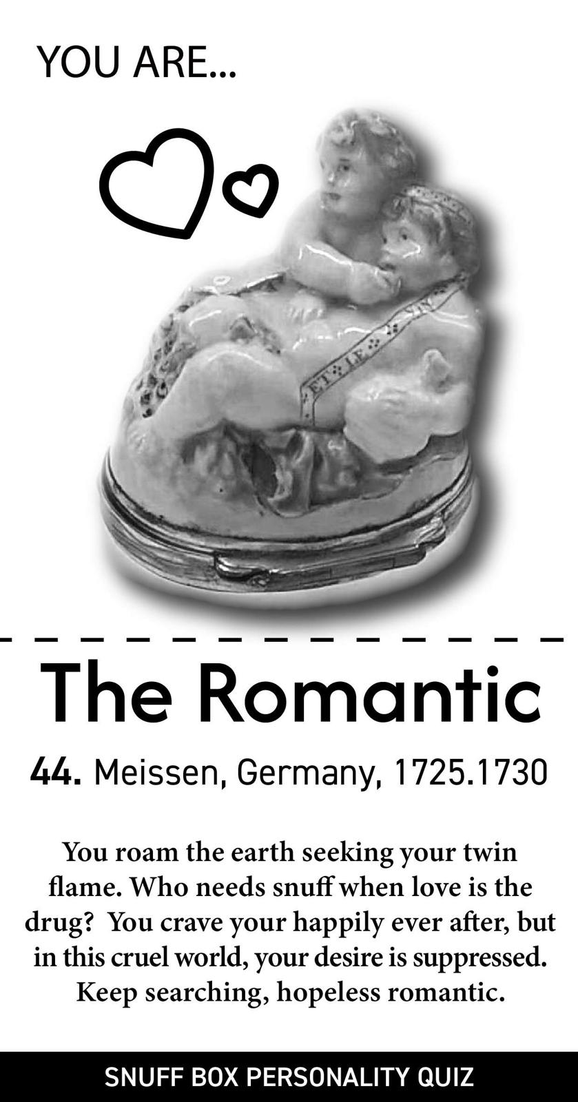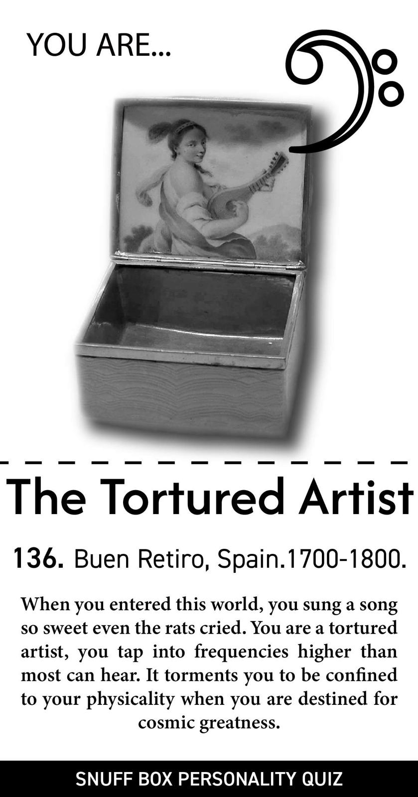 "Forget Myers Briggs, forget the Big 5, forget every personality test that makes you feel misunderstood. Here at Designmuseum Denmark, we have developed a 99.9% effective algorithm that can determine what kind of personality you have from answering just FIVE questions, and the best part, you will be matched to your very own snuff box from the museum’s extensive snuff box collection.