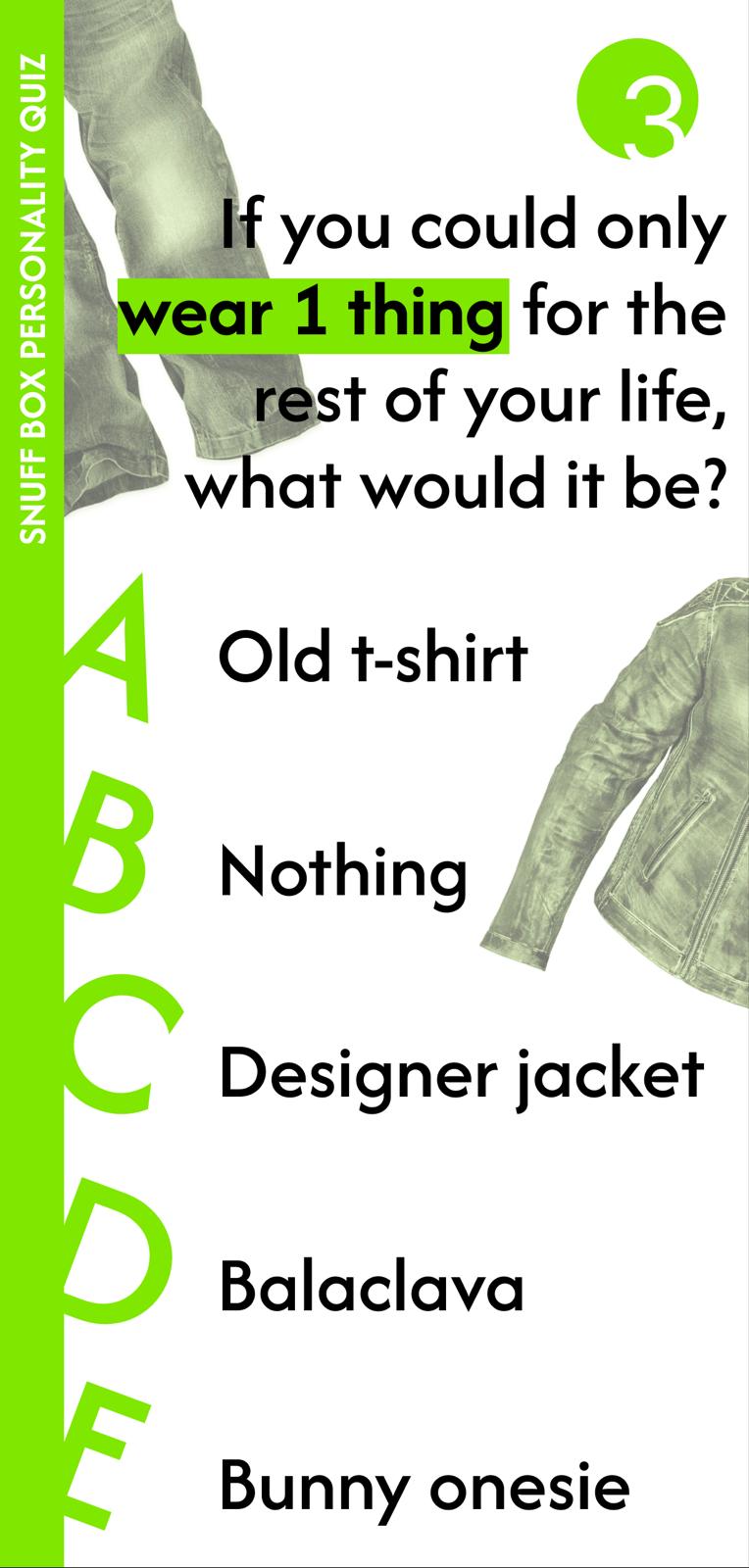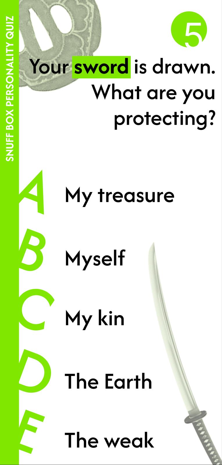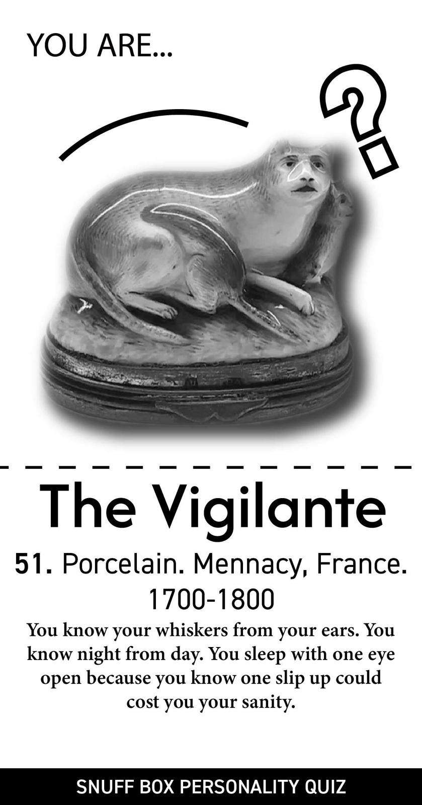 "Forget Myers Briggs, forget the Big 5, forget every personality test that makes you feel misunderstood. Here at Designmuseum Denmark, we have developed a 99.9% effective algorithm that can determine what kind of personality you have from answering just FIVE questions, and the best part, you will be matched to your very own snuff box from the museum’s extensive snuff box collection.